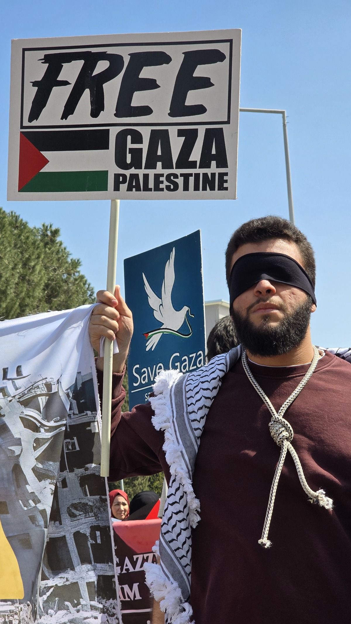 Yürüyüşte en dikkat çekici sembolizm ise gözleri ve elleri bağlı şekilde yürüyen öğrenciler oldu. Bu sembolik duruş, Filistinlilerin maruz kaldığı baskı ve çaresizliği temsil ederken, aynı zamanda uluslararası kamuoyuna güçlü bir mesaj verdi. Sessiz ama etkili bu protesto, katılımcıların vicdanlarıyla konuştuğu bir an olarak hafızalara kazındı.